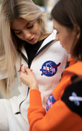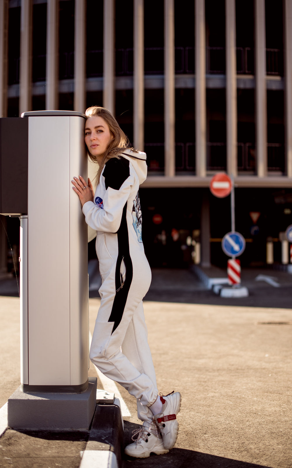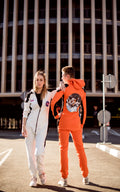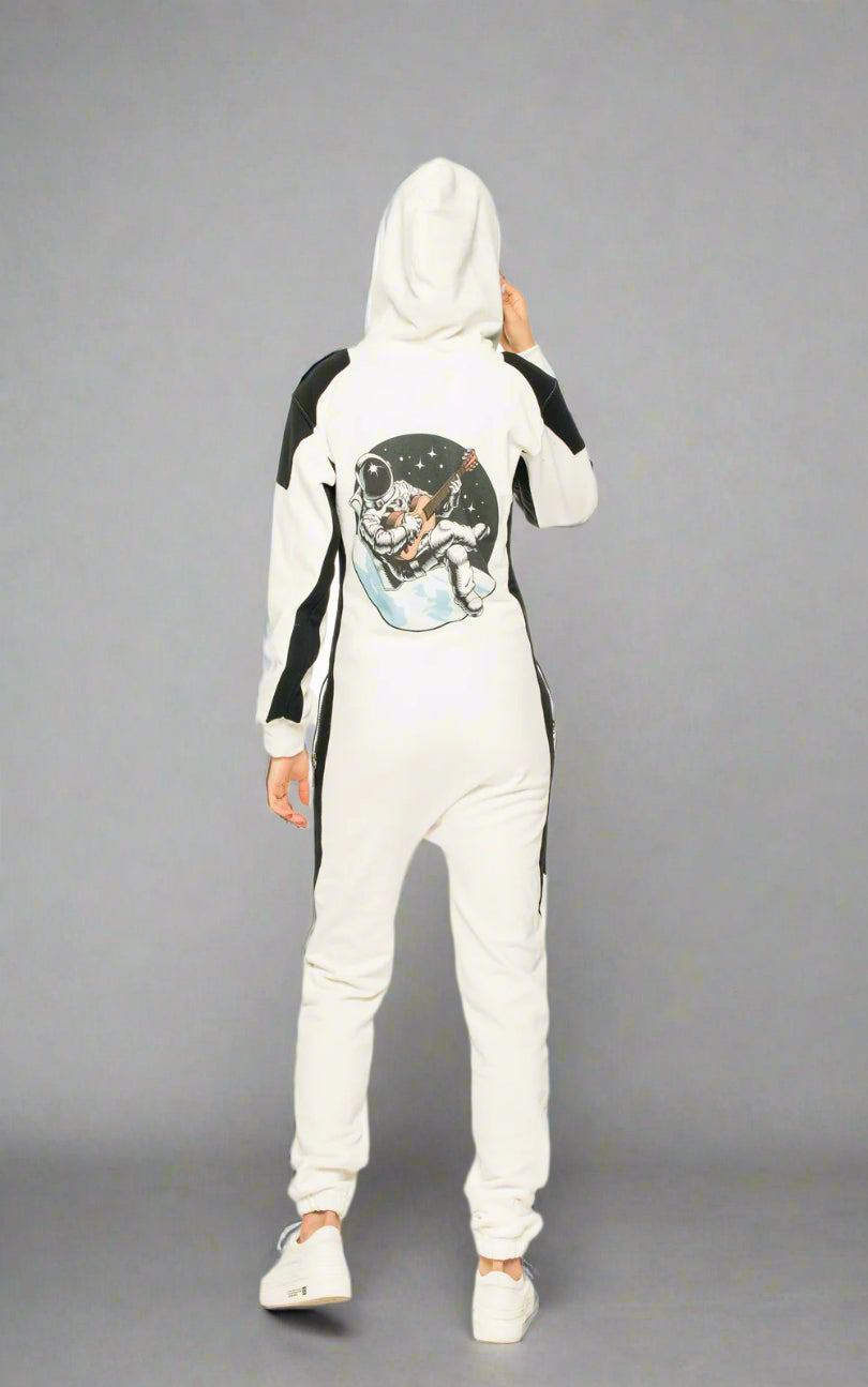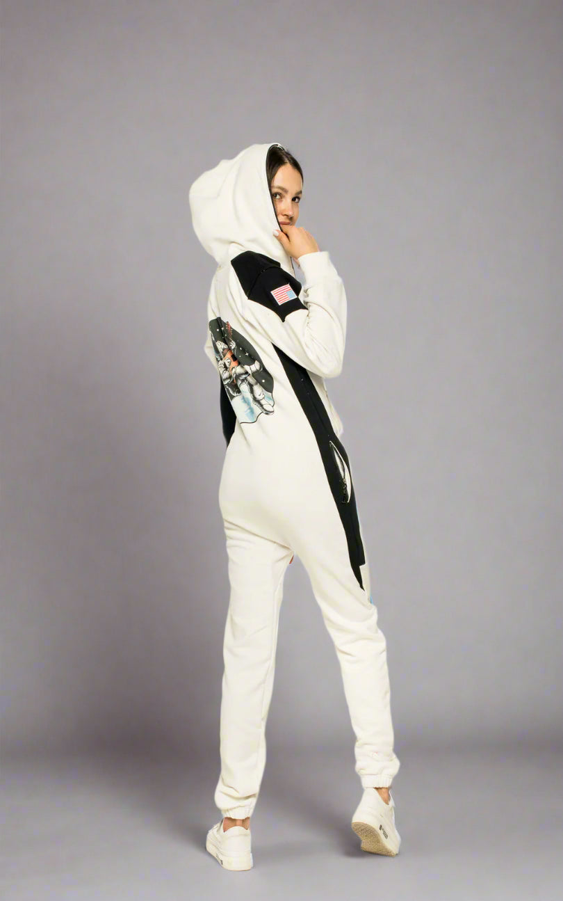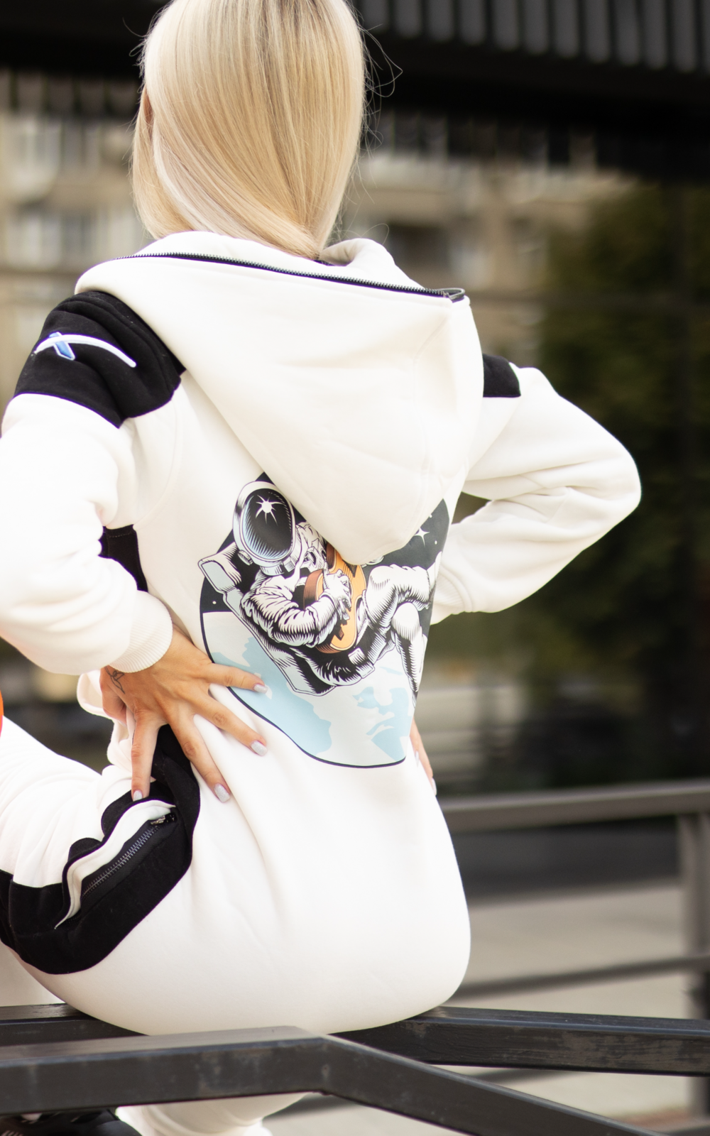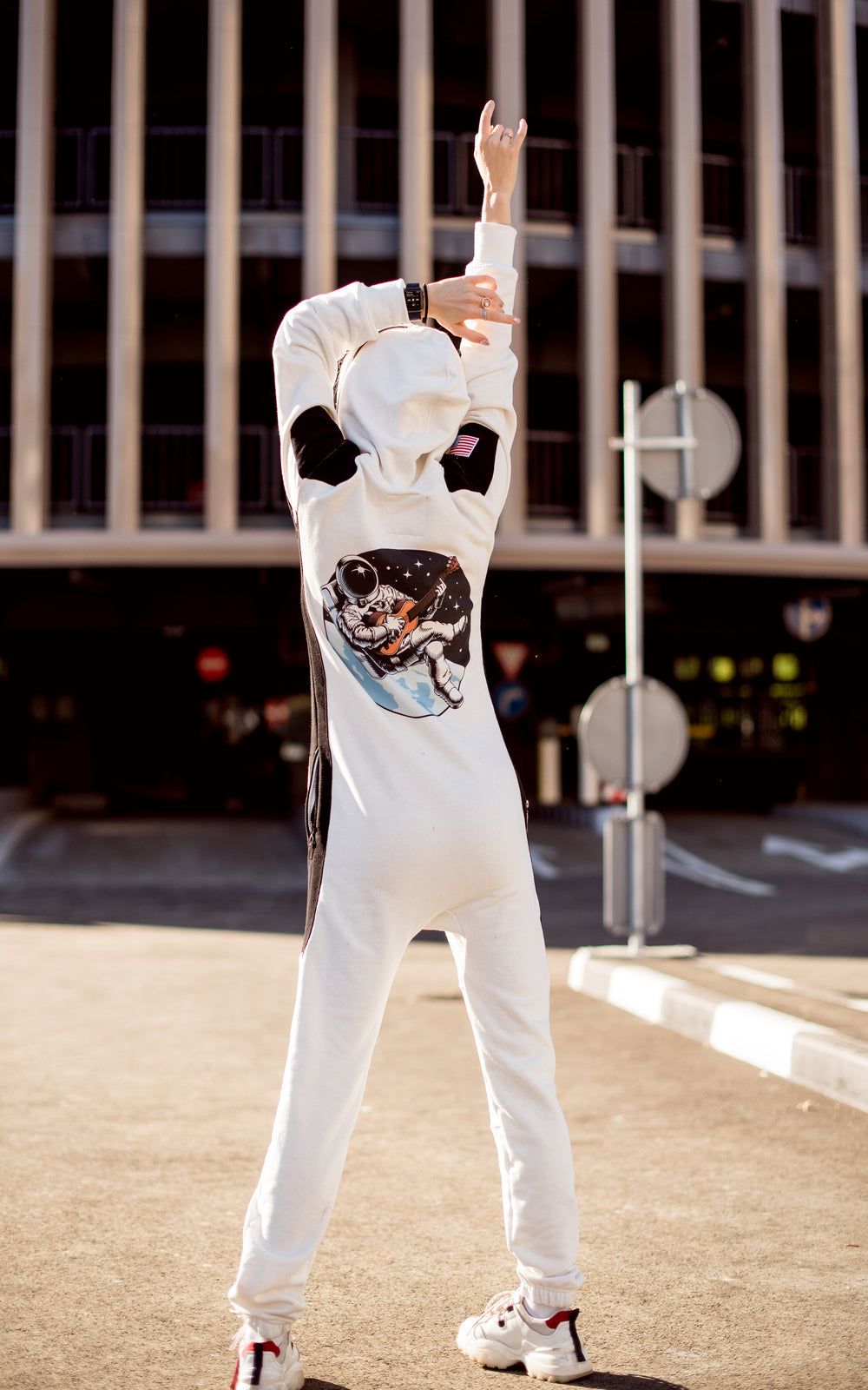 Космічний комбінезон натхненний безмежними просторами Космосу. На вибір є кілька яскравих кольорових варіантів - помаранчевий, насичений синій та білий. На спині великий, щільний принт, який не тріскається, не відшаровується та не вицвітає з часом. По всьому комбінезону є латки у стилі космічної уніформи.