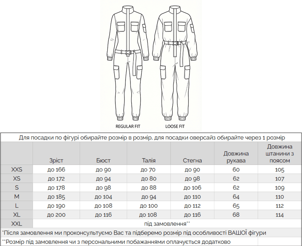Ми можемо допомогти вам підібрати потрібний розмір та за потреби підібрати комбінезон за вашими мірками. Просто напишіть нам тут (синім кольором позначено "тут" – це посилання на месенджер).