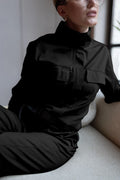 Комбінезон виконаний у строгих монохромних відтінках. Такий вибір кольорів підкреслює класичну та стильну сторону комбінезона, дозволяючи легко поєднувати його з різними аксесуарами та взуттям. Стильні деталі у шевронах додають нотку авантюрного духу до строгості образу. Тканина цього комбінезона на дотик нагадує м'який бавовняний денім з ніжним шовковистим ефектом. Він створює елегантний та водночас розслаблений образ.