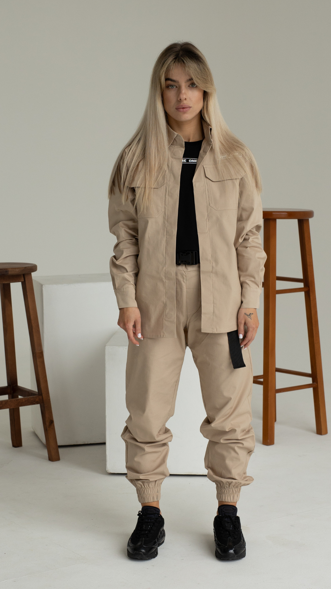 У міському ритмі: Чудова альтернатива джинсам. Образ виглядає зібрано і доречно як на прогулянці, так і на неформальній зустрічі.